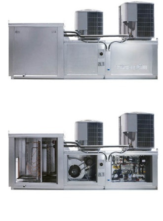 The modular packaged cooling unit is optimized to work in conjunction with highly efficient make-up air delivery methods, such as perimeter supply plenums. The unit can either have a down or end discharge, and can be used with both electric and gas heat. All refrigerant is environmentally friendly R-410A and condensers have a nominal SEER rating of 14 for greater efficiency.